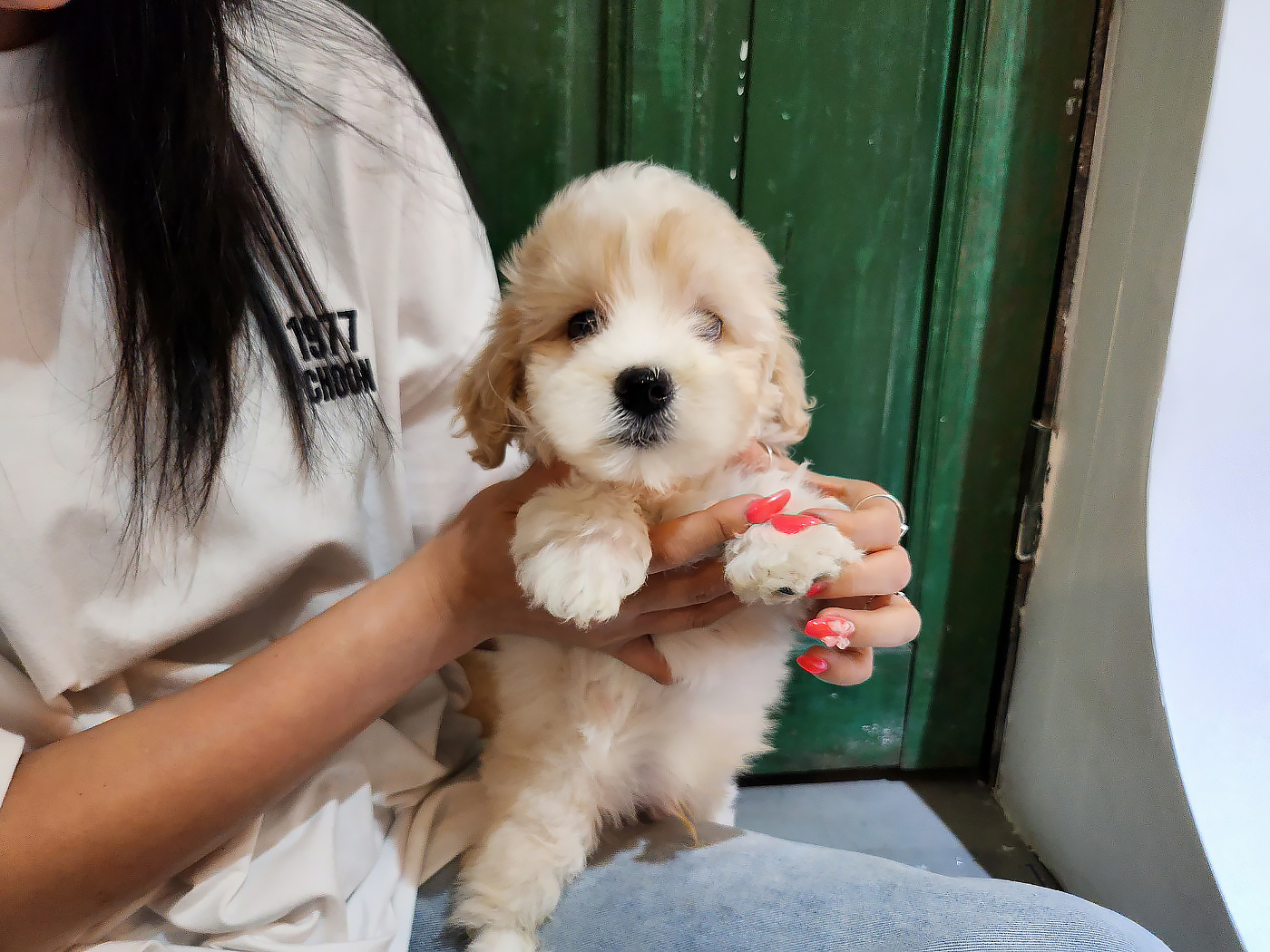 뽀글뽀글 파마머리에뚜렷한 크림&화이트 무늬양말까지 신었어요!애칭은 뭐라지어줄까 고민하다가 호동이로 결정 ..ㅎ동배 포동이는 다음 게시글에서바로 만나보실 수 있습니다! 순둥한 눈매에
